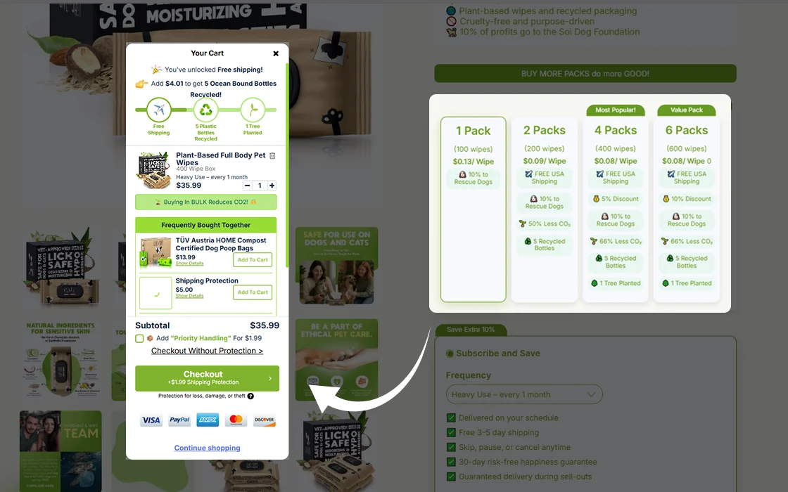 • Trust signals like eco-certifications and donation impact